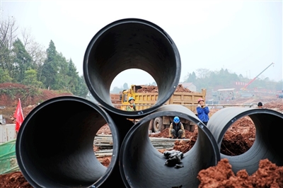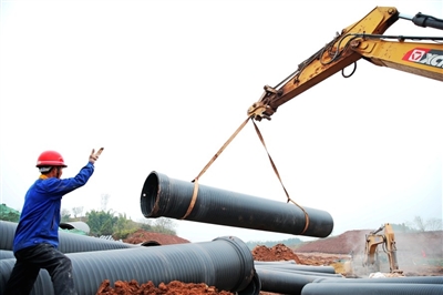 上左:1月2日,东部新区PPP项目健康路东段,工人抓紧施工。上右:1月2日,东部新区建设工地,工人在切割钢管。 下左、下中:1月3日,东部新区PPP项目健康路东段,工人正安装管网。
