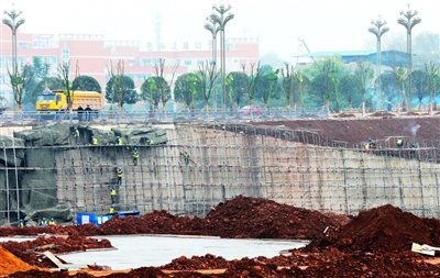 下右:1月3日,三合湖公园建设工地,工人对湖堤工程进行混凝土施工。